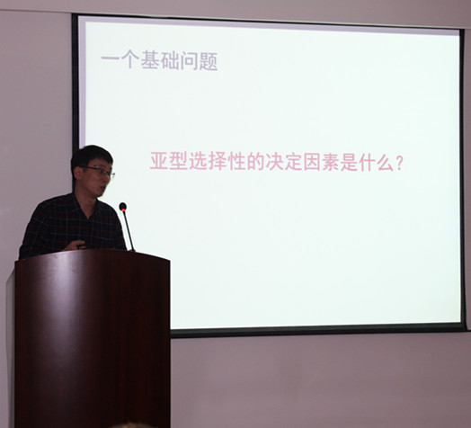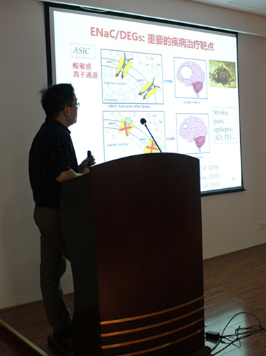 于烨研究员的报告题目为“神经退行性蛋白/上皮钠通道超家族配体门控性质的进化初探”。首先,于研究员介绍了离子通道蛋白应对物理化学信号刺激的模式和机制、及其与其生物功能项关的关键蛋白质群。然后,于研究员就其课题组的研究方向,详实的介绍了神经退行性蛋白/上皮钠通道超家族(ENaC/DEGs)在神经精神疾病中的重要调控作用和治疗靶标、以及ENaC/DEGs具有复杂多样的激活方式的特性。以非质子配体GMQ为例,CMQ可通过非酸类全新方式激活酸敏感性通道(ASIC),并引发动物疼痛敏感化行为;GMQ还可直接调控FaNaC门控通道。因此,FaNaC作为一类新发现的ENaC/DEGs亚家族,与ASIC具有更接近的活动特性,也成为调控神经精神疾病的重要新靶标。于烨研究员主要从事重要疾病相关膜蛋白跨膜信号转导过程中的关键生物物理问题及其新型活性分子发现方面的研究,获得教育部长江青年学者,国家自然科学优秀青年基金等多项人才计划,主要学术成果发表在Neuron, Plos Biol, Nat Coummun, Cell Res, J Bio Chem等高水平杂志。