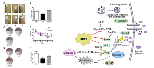 研究人员首次发现给予DDPU的AD模型小鼠出现了明显的脑内蛋白沉淀斑减少以及神经细胞凋亡减少,并且小鼠记忆损伤以及认知障碍得到明显恢复。机制研究结果显示,DDPU通过抑制PERK/eIF2a通路以减少BACE1的翻译从而抑制Aβ的生成,此外,DDPU调节PI3K/AKT/mTOR通路以增强自噬作用,从而加强Aβ的清除。通过“一石二鸟”策略逆转了脑内Aβ蓄积-既能抑制Aβ的生成,又能增加Aβ的清除。更重要得是,DDPU一方面能够通过减少Aβ的聚集来减轻内质网应激的发生,同时通过全面抑制PERK、IRE的磷酸化激活、降低GRP78和CHOP的蛋白含量缓解内质网应激,并进一步抑制下游JNK的磷酸化和caspase-3的剪切活化,增加抗凋亡蛋白Bcl-2的蛋白含量,从而发挥抗细胞凋亡的作用。