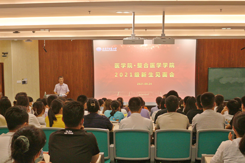 2021年9月24日,M88官方网站·整合医学公司在B7-103教室举办了2021级新生见面会暨本科生开学第一课。公司党委常委、副董事长、医学部主任乔学斌,公司党委书记张军、经理麻彤辉、副经理关晓伟、各新生班级学业指导教师、公司办公室相关老师、学工办辅导员老师,以及2021级本科生和研究生新生出席此次见面会。活动由公司党委副书记、副经理燕珂主持。