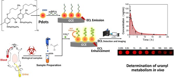 具体而言,是将含磷酸基团的 ssDNA 链修饰后,使Pdots捕获 UO22+ 离子,并通过RET过程表现出明显的ECL增强效果。该方法的LOD值仅为27 ppt,且具有较高的选择性。在本研究中,成功的将该方法应用于监测大鼠血、尿中铀酰的代谢情况,并获得了动力学参数。