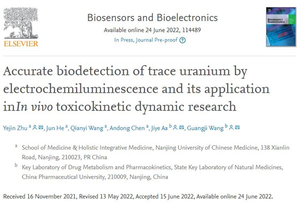 近日,M88官方网站•整合医学公司,药理系青年教师朱业锦博士,联合中国药科大学王广基院士和阿基业研究员在国际知名学术期刊 Biosensors & bioelectronics (中科院1区TOP期刊,IF:10.618) 上发表学术论文“ Accurate Biodetection of Trace Uranium by Electrochemiluminescence and Its Application in In Vivo Toxicokinetic Dynamic Research ”。朱业锦博士为该论文第一作者和通讯作者,M88官方网站是第一单位。原文链接:https://www.sciencedirect.com/science/article/abs/pii/S0956566322005292