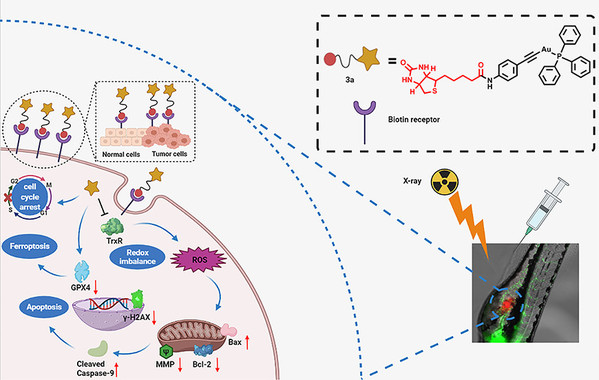 该研究开发了一系列新的生物素靶向Au(I)化合物。通过系统的生物学评价和比较,筛选出了含有三苯基膦配体的生物素化Au(I) 化合物3a,其对癌细胞既具有显著的高效抑制作用,又具有选择性的细胞毒性,效果优于目前常用的金诺芬。同时,化合物3a作为一种强效放射增敏剂,可以在体内外增强抗癌作用,具有增敏选择性。从作用机制上,3a通过靶向结合和强抑制硫氧还蛋白还原酶(TrxR)干预氧化还原稳态,诱导铁死亡过程,使肿瘤细胞对放疗敏感。