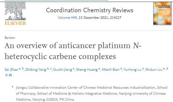 此外,课题组近期还在化学权威期刊Coordination Chemistry Reviews(IF: 24.833)上在线发表了综述论文“An overview of anticancer platinum N-heterocyclic carbene complexes。”刘武昆为最后通讯作者。原文链接:https://doi.org/10.1016/j.ccr.2021.214217。