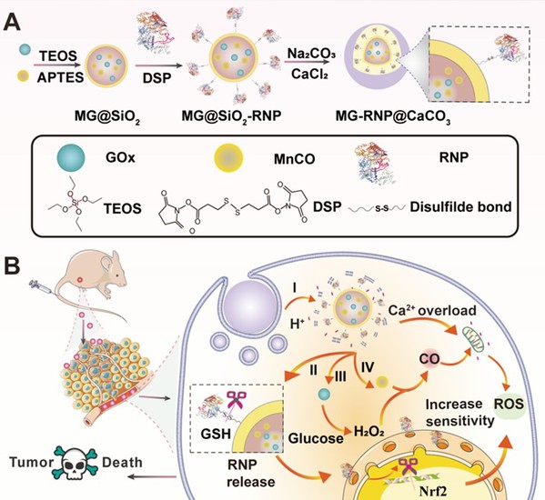 针对以上科学和技术问题,M88官方网站韩欣教授团队联合南京大学宋玉君教授团队基于无机二氧化硅纳米反应器构建了一种pH/谷胱甘肽(GSH)共刺激响应性CRISPR/Cas9基因编辑纳米递送平台,结合钙离子(Ca2+)增强CO气体疗法进行精准的肿瘤治疗研究。在该工作中,作者通过GSH响应性二硫键连接剂将CRISPR体系共价连接在二氧化硅纳米颗粒上,并在其表面功能包覆一层碳酸钙(CaCO3)用于保护其血液循环中的稳定性。当该纳米药物进入肿瘤微环境后,通过肿瘤酸性pH环境下诱导水解,导致CaCO3层快速生物降解,负载的葡萄糖氧化酶(GOx)通过联级酶促反应,一方面消耗肿瘤细胞内的葡萄糖进行“饥饿疗法”,一方面产生过量H2O2与负载的锰羰基(MnCO)反应产生CO实现气体的精确可控释放,实现高效低毒的癌症治疗。CO能够靶向肿瘤细胞线粒体,损害肿瘤细胞的线粒体生物能产生大量ROS,同时来自CaCO3降解产生的Ca2+超载能够干扰线粒体Ca2+稳态引起线粒体功能障碍。此外,肿瘤微环境中过表达的GSH诱导二硫键的裂解,释放出Cas9/sgRNA蛋白复合体进行特定部位的基因编辑,通过靶向应激缓解调节因子NRF2降低肿瘤细胞对于Ca2+增强CO气体疗法的应激耐受性,实现了有效杀伤肿瘤同时降低毒副作用的目的。这种智能可控的治疗策略充分结合了CRISPR精准基因编辑以及离子和气体的协同抗肿瘤作用,在未来的精准基因编辑和纳米医学临床应用中显示出巨大的潜力。