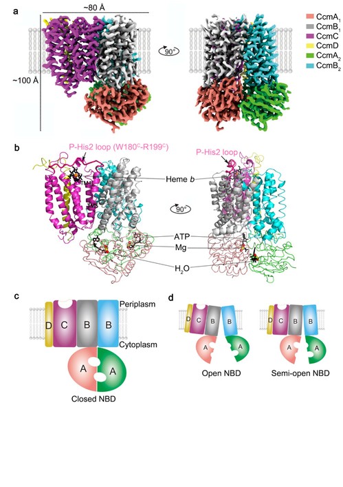 细胞色素c (cytochrome c)使用血红素 (heme) 作为辅助因子,在呼吸作用和光合作用中的电子传递过程起着至关重要的作用。由八种膜蛋白 (CcmABCDEFGH) 组成的细胞色素c成熟系统I (cytochrome c maturation system I)催化血红素共价结合在细胞色素c蛋白的半胱氨酸残基上。由于所有细胞色素c都存在胞外,而血红素在胞内合成,从而要求血红素首先被运输到胞外,再结合血红素伴侣蛋白CcmeE而进行下一步催化反应。以往研究表明:膜蛋白复合物CcmABCD行使运输heme与催化heme和CcmE共价连接的功能,但该过程的结构基础和机制尚不清楚。本研究以单颗粒冷冻电镜 (cryo-EM) 解析了一系列高分辨率CcmABCD蛋白以及蛋白-ATP复合物和蛋白-抑制剂复合物的结构,定位了CCmA中的ATP结合位点和CCmC中的血红素结合位点,基于这些结构结合功能研究,论文作者提出了血红素运输,血红素转移到CcmE形成CcmE-heme复合物,以及依赖于ATP水解释放CcmE-heme的模型。CcmABCD是一种ABC转运蛋白 (ATP-binding cassette (ABC) transporters) 复合物,利用ATP水解的能量将血红素从一个结合位点 (CcmC)转移到另一个结合位点 (CcmE)。