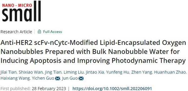 2023年2月,M88官方网站∙整合医学公司郭军教授团队在国际知名学术期刊Small(中科院材料科学一区, IF=15.153)公开发表了基于氧纳米气泡、细胞色素c融合蛋白与光动力联合治疗乳腺癌的最新研究成果(图1),论文题目为“Anti-HER2 scFv-nCytc-Modified Lipid-Encapsulated Oxygen Nanobubbles Prepared with Bulk Nanobubble Water for Inducing Apoptosis and Improving Photodynamic Therapy”。(原文链接:https://pubmed.ncbi.nlm.nih.gov/36855335/)。