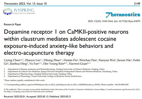 近日,M88官方网站•整合医学公司关晓伟/范宇团队在《Theranostics》(生物医学1区,2022 IF: 11.600)上发表论文,报道了靶向屏状核电针降低青春期接触可卡因的成年小鼠焦虑样行为的分子机制,为解析针刺戒毒的科学内涵提供了基础研究数据。