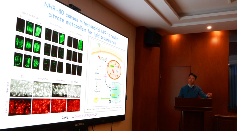 梁教授的报告题目为“Regulation of Lipid Droplet Growth in Health and Disease”。基于多年的脂滴生物学和代谢疾病研究,梁教授聚焦于脂质代谢领域中的前沿科学问题,利用线虫、树鼩和小鼠等多种模式动物,介绍了脂滴生物学和代谢相关脂肪性肝病(MASLD)等领域的新进展,并就脂滴生物学和代谢疾病领域前沿进展与现场师生进行了互动讨论,回答了师生们提出的磷脂与肺部疾病、脂滴与先天免疫、膜脂成分与线粒体结构功能等热点问题,激发了大家对生命科学前沿问题的深入思考,为开展中医药防治代谢性疾病的基础医学研究提供了新思路。